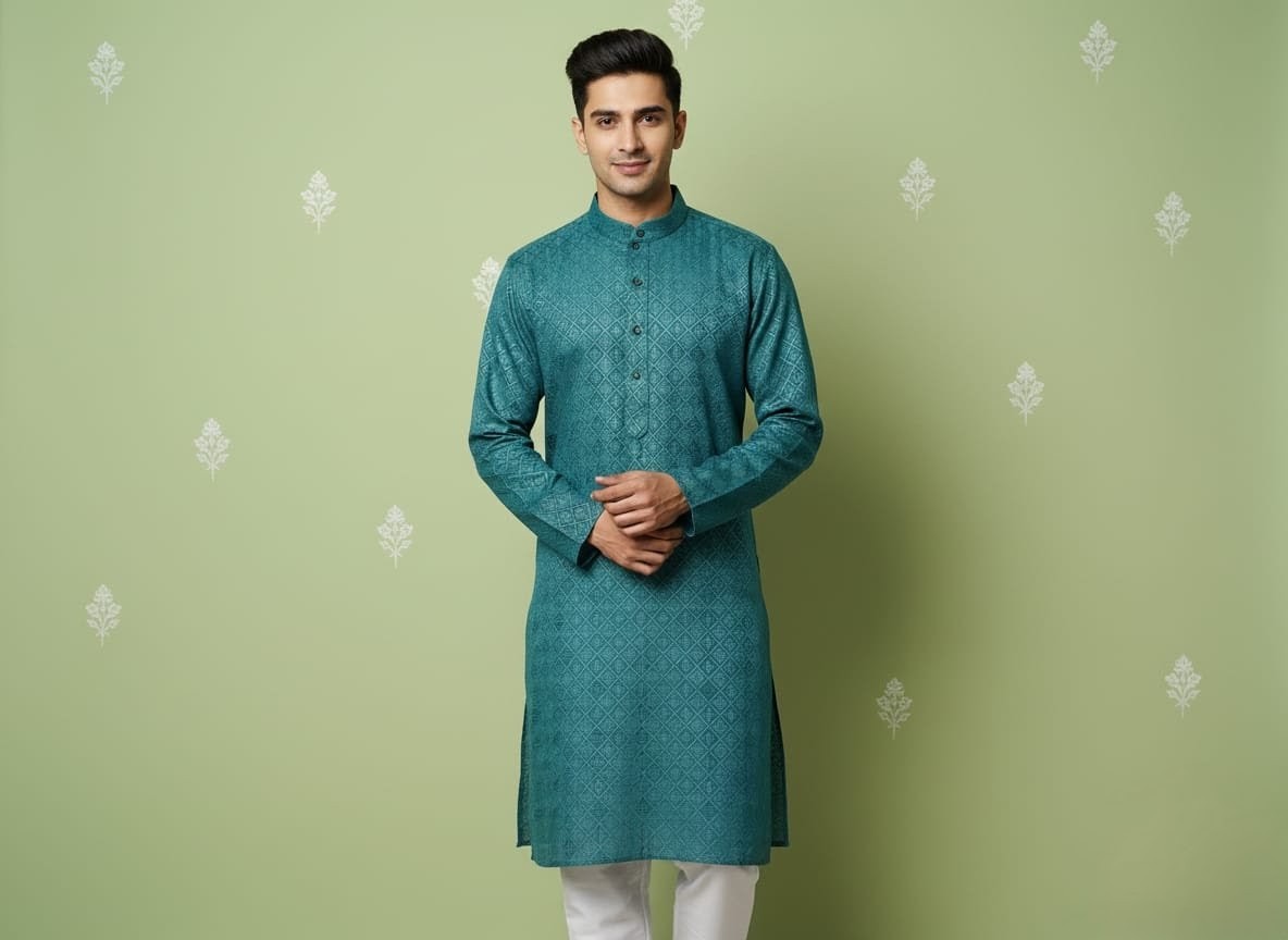 Make a refined statement with this striking Teal Kurta and Pyjama Set. The kurta features a captivating, all-over self-design of intricate geometric patterns woven directly into the fabric (often called Jaquard or tone-on-tone embroidery/weave), giving it a rich texture and depth. The lush Peacock green color is sophisticated and perfect for festive evenings, weddings, or formal gatherings. It features a classic Mandarin (Nehru) collar and a clean buttoned placket with coordinating dark buttons. For a crisp contrast, the set includes comfortable, traditional solid white cotton pyjamas with a drawstring waist. Crafted from a premium blend for a structured yet comfortable fit, this set is an elegant addition to any ethnic wardrobe.
