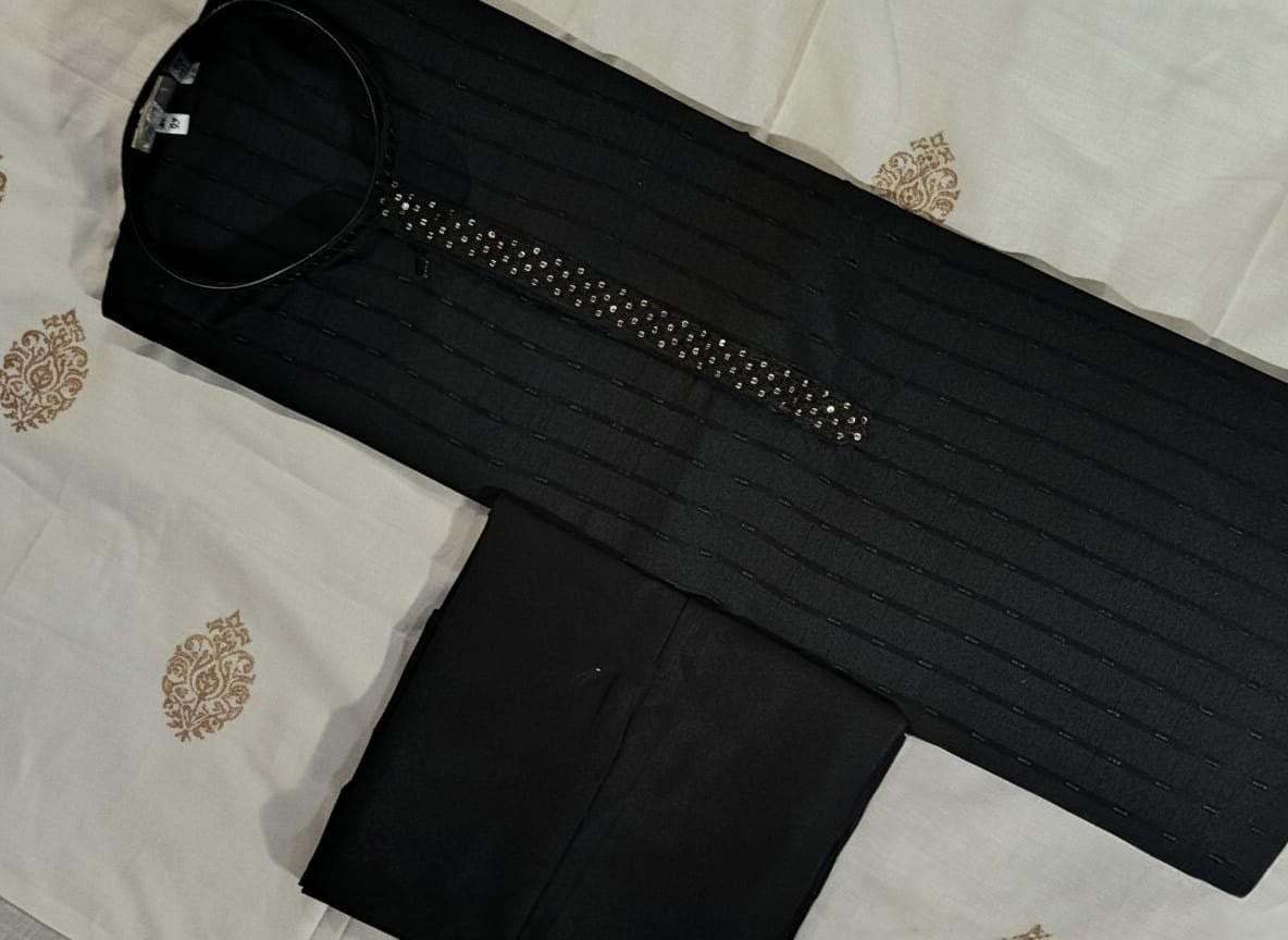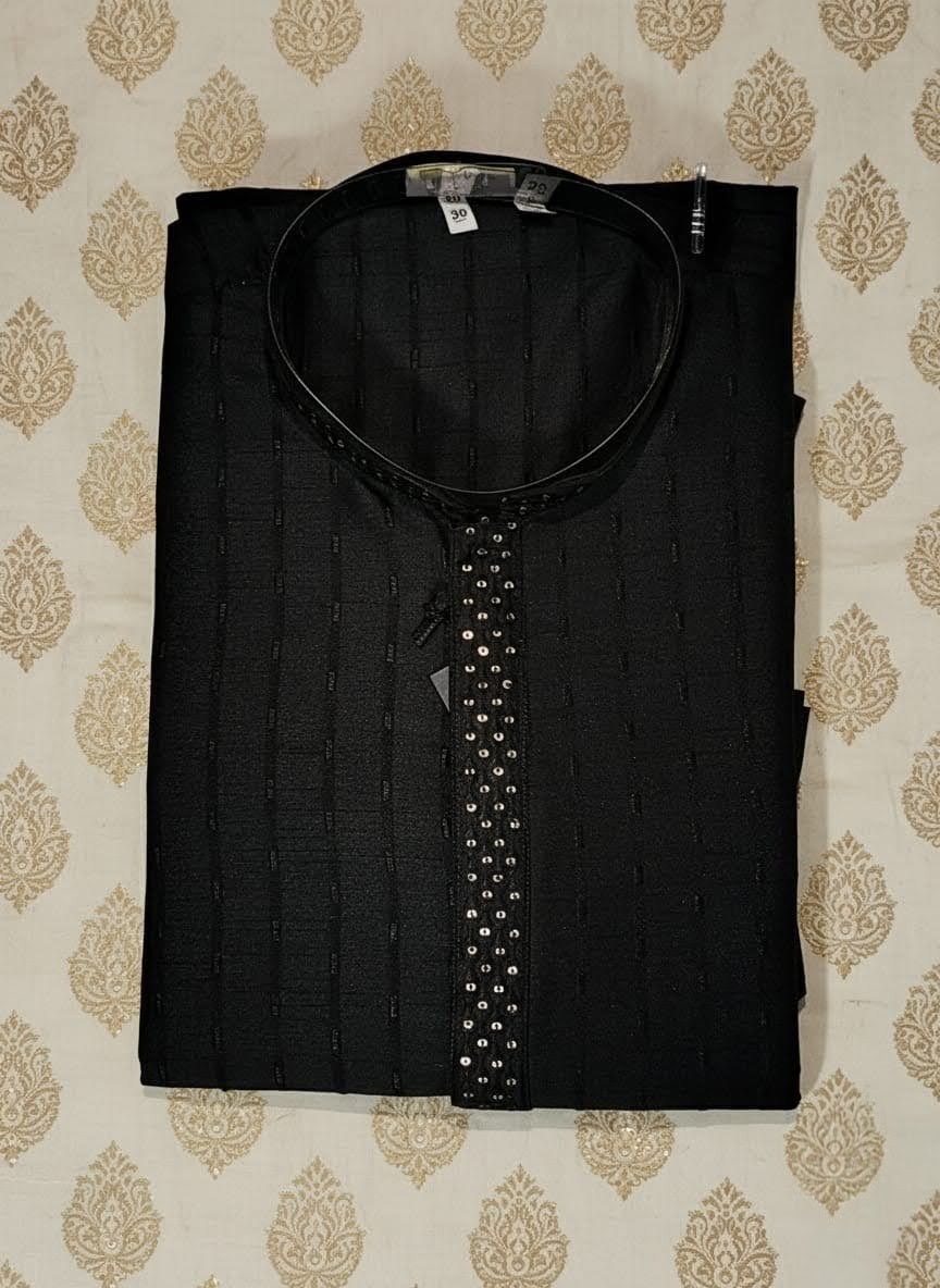 This elegant black kurta features a straight-cut design with a mandarin collar and studded placket for a modern, festive look. Crafted from smooth fabric with subtle texture, it pairs perfectly with matching black bottoms. Ideal for parties, weddings, and celebrations, offering a refined blend of tradition and contemporary style.