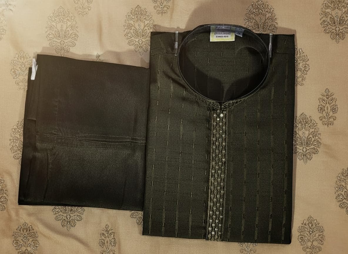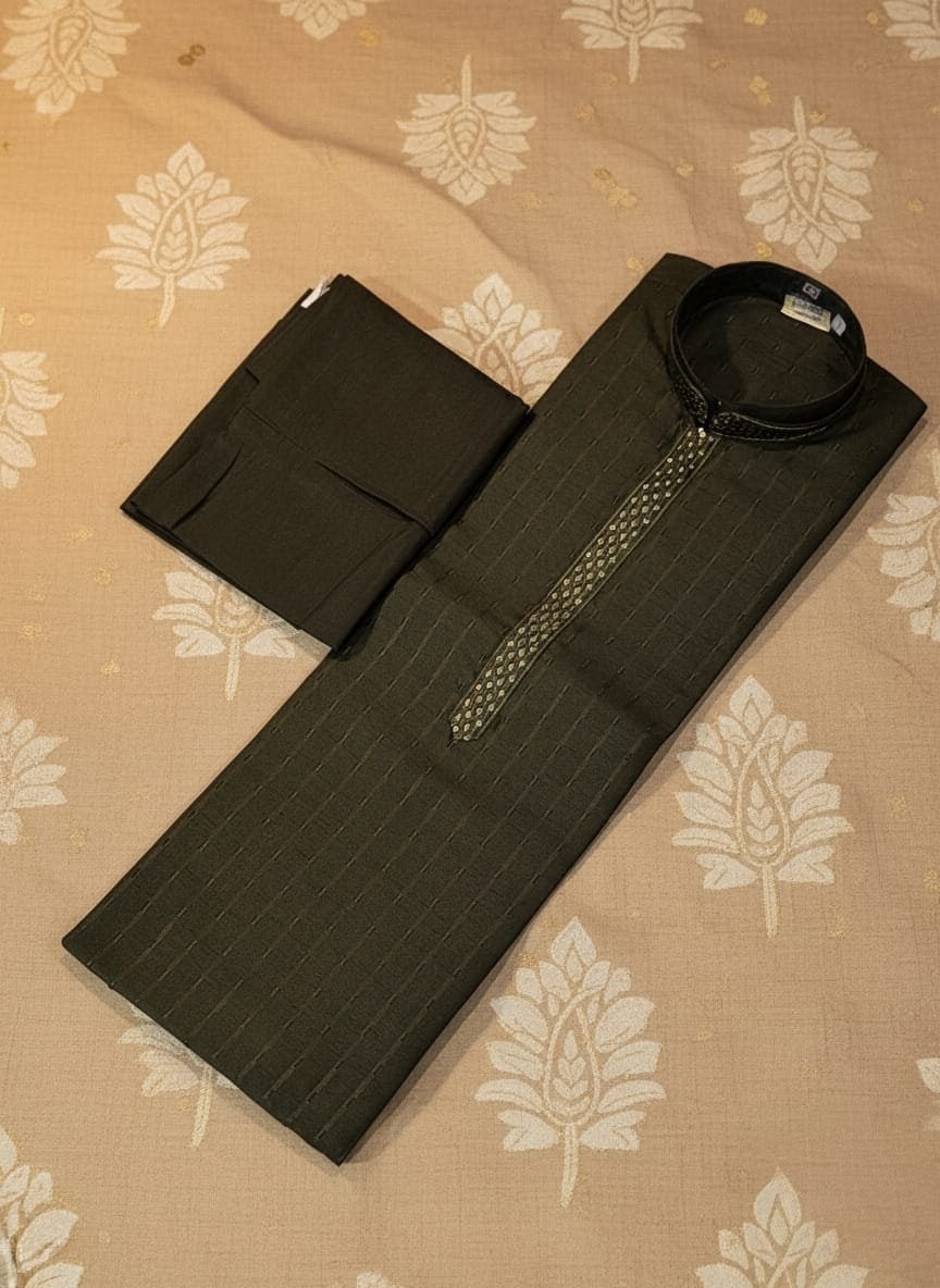 This elegant Mehndi kurta features a straight-cut design with a mandarin collar and studded placket for a modern, festive look. Crafted from smooth fabric with subtle texture, it pairs perfectly with matching Mehndi bottoms. Ideal for parties, weddings, and celebrations, offering a refined blend of tradition and contemporary style.